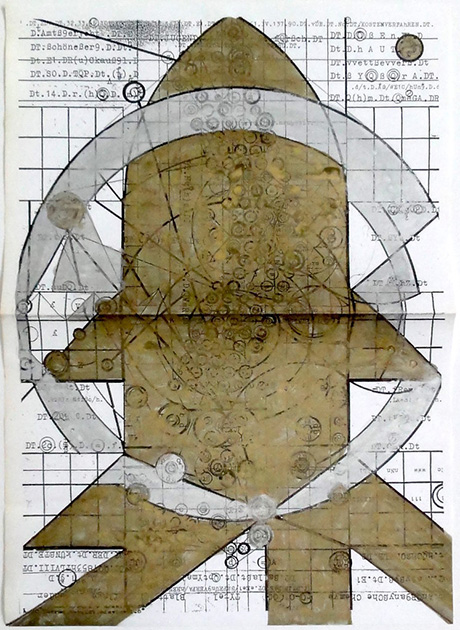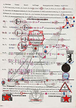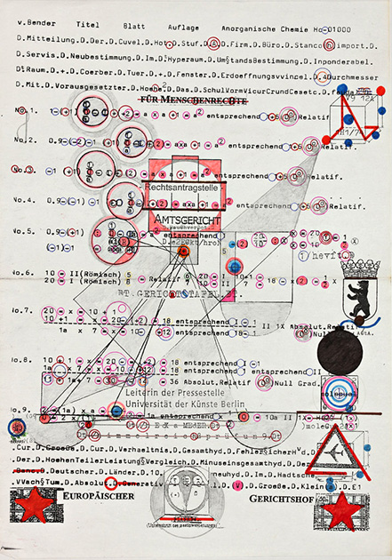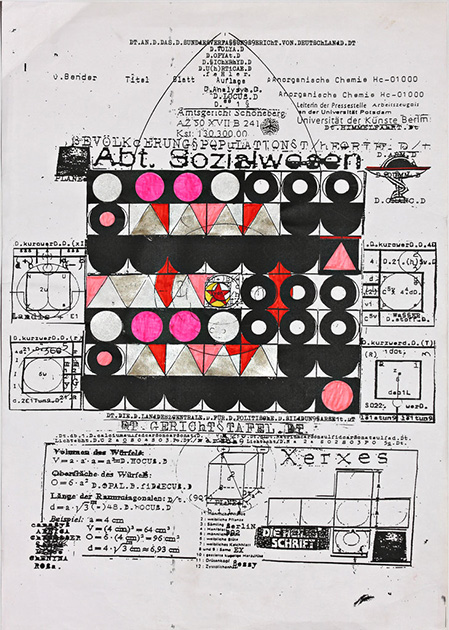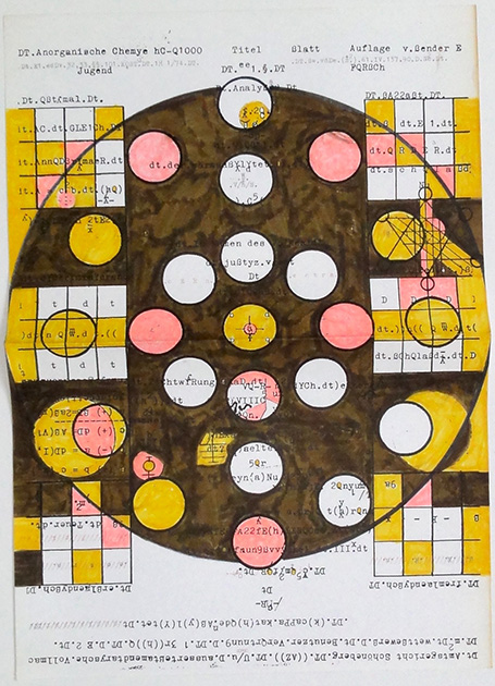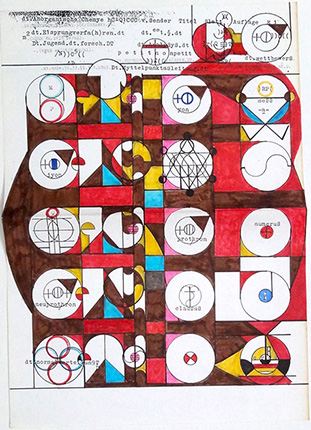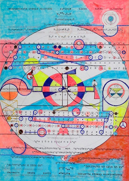 Adelhyd van Bender zeichnete, schrieb, fotokopierte, retouchierte mit Besessenheit tausende und abertausende von Papierbögen mit geometrischen Formen und Farbfeldern, wobei er auf wissenschaftliche, mathematische und physikalische Grafiken und Formeln zurückgriff und Bogen für Bogen füllte. Die Essenz seiner Arbeit ist geprägt von der Vorstellung, dass er einen weiblichen Uterus in sich trage, in dem er ein „atomares Geheimnis“ verwahrt. Ein weiteres zentrales Thema ist die Form des Quadrates, die mit dem Symbol der Kaaba, dem schwarzen Kubus in Mekka, assoziert wird. Aber auch planetarische Konstellationen, Raketen und die damit verbundene Vorstellung, dass er Himmelfahrtsprüfungen bestehen muss um in den Himmel aufzusteigen, sind Kernkonzepte in Benders Universum. Seine technischen und wissenschaftlichen Symbole sind rätselhaft, faszinierend und rasend wie der technische Fortschritt selbst. Benders Werk verkörpert dies mit Gewissenhaftigkeit, mit Pseudosystematik und der unantastbaren Authorität der Wissenschaft. In seinem Archiv kann er das allumfassende Universum in Mappen verschlossen und das Chaos kontrollierbar halten.