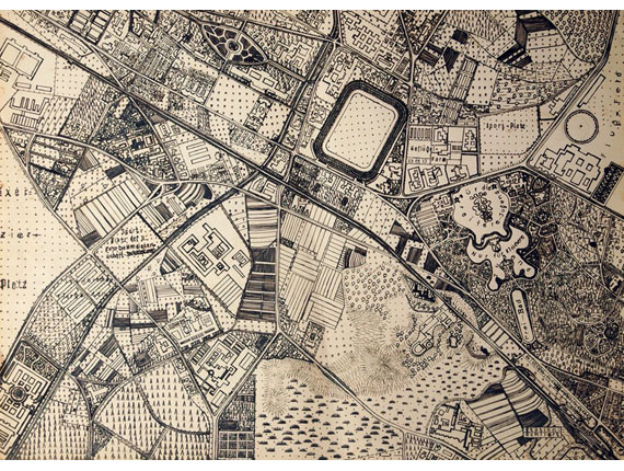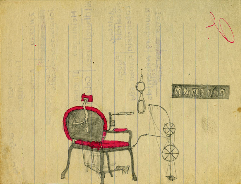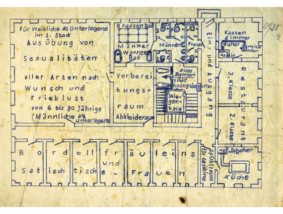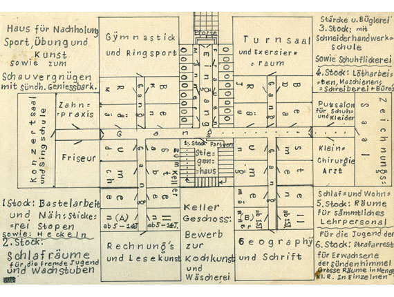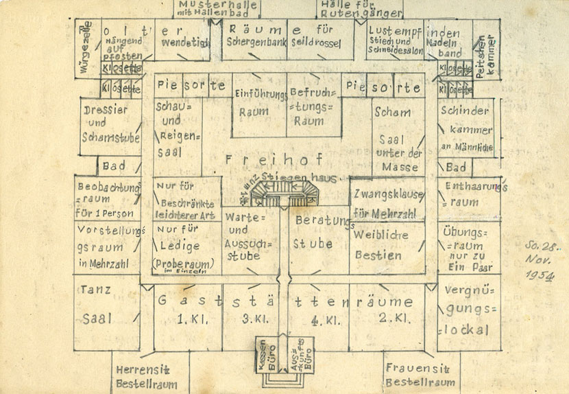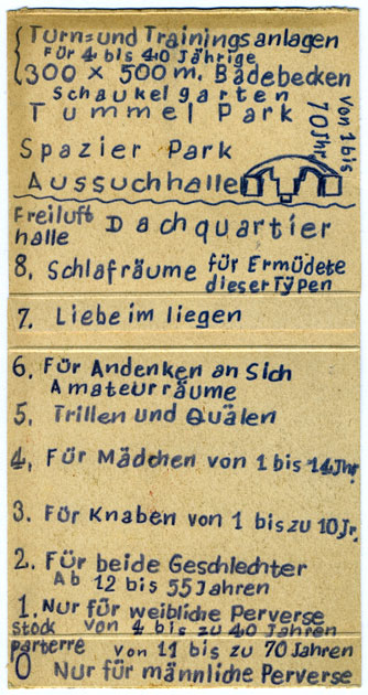 Und dann gibt es noch die Welt im Untergrund: eine Serie von Blaupausen für Räume, wahrscheinlich untertage, die Erhard entwarf. Diese fantastischen psycho-architektonischen Baupläne zeigen Räume zur „Ausübung von Sexualitäten aller Arten nach Wunsch und Trieblust“ für „perverse Männer“ und „sadistische Frauen“ oder ein „Haus für Nachholung Sport, Übung und Kunst sowie zum Schauvergnügen mit sündhafter Geniessbarkeit.“