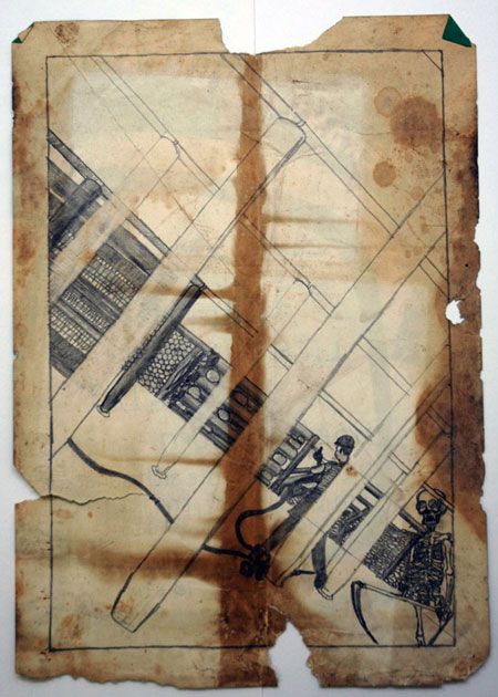 Beim Betrachten von Martin Erhards Werk fällt einem der Gegensatz zwischen der überirdischen und der unterirdischen Welt auf: eine seiner kartografischen Landschaften besteht aus über 50 DIN A2 Bögen, die insgesamt eine Fläche von über 75 Quadratmetern einnehmen. Zu sehen ist eine detaillierte topografische Aufzeichnung, die entlang einer ununterbrochenen, endlosen Bahntrasse Felder, Grenzen, Bahnhöfe und die gelegentlichen Fördertürme in die Tunnel untertage beschreibt.